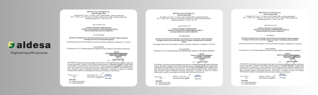 Aldesa uzyskała pozytywną decyzję Urząd Dozoru Technicznego, potwierdzającą spełnienie najwyższych wymagań w zakresie kompetencji technicznych, organizacyjnych oraz systemów jakości.
