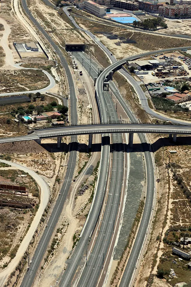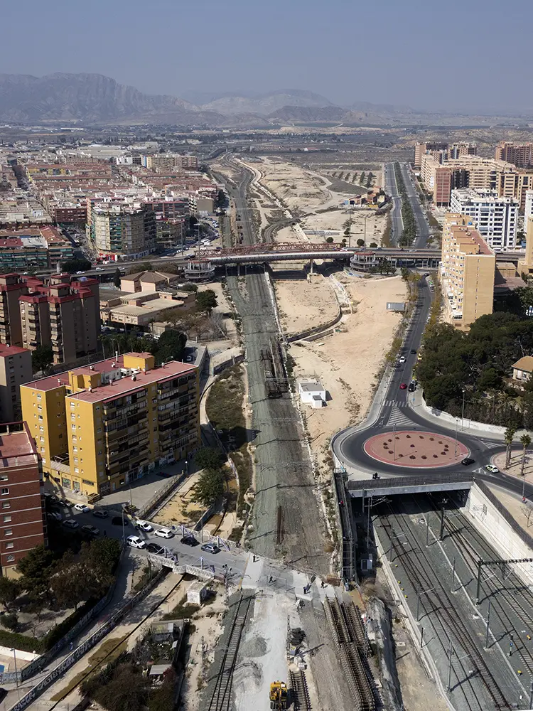 Obras complementarias del nuevo acceso ferroviario de alta velocidad de Levante. Madrid–Castilla-La Mancha–Comunidad Valenciana–Región de Murcia. Tramo: Accesos a Alicante. Fase II, Sección Norte. El proyecto incluye actuaciones para optimizar la funcionalidad y seguridad de los accesos a la estación de Alicante dentro del corredor de alta velocidad de Levante. Las obras comprenden la supresión de un paso a nivel entre las calles Santo Domingo y Ausó y Monzó, la instalación de catenaria para la explotación en ancho ibérico, intervenciones en la propia estación y la creación de una nueva zona de aparcamientos. La actuación refuerza la integración urbana de la infraestructura, mejora la operatividad ferroviaria y contribuye a la modernización del nodo de transporte, favoreciendo la conectividad de Alicante con el resto de la red de alta velocidad