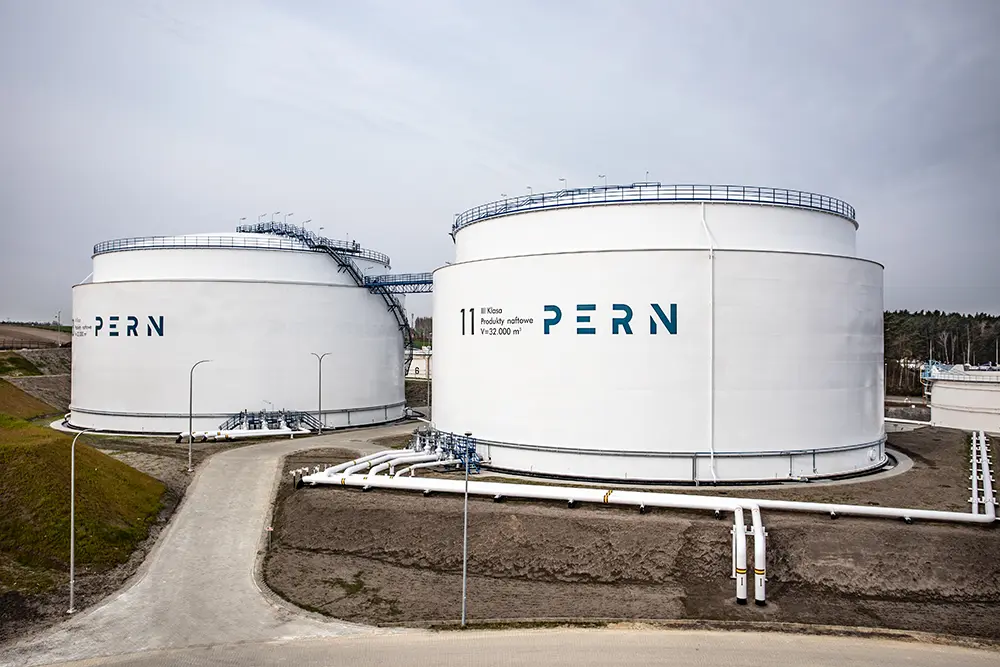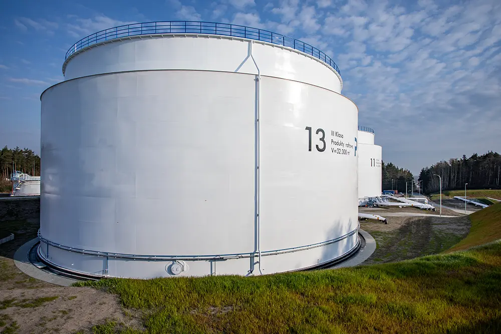 Construcción de dos tanques de almacenamiento de productos petrolíferos de Clase III, de 32.000 m³ cada uno, junto con la infraestructura asociada, en la Base de Combustibles nº 21 en Dębogórze (Polonia). El alcance incluyó la ejecución de cimentaciones de hormigón armado monolítico, montaje de estructuras metálicas, instalación de redes de proceso, eléctricas, de saneamiento y de abastecimiento de agua, así como sistemas contra incendios y control automatizado. Se construyeron 390 metros de tuberías de proceso DN500, depósitos de retención, viales de servicio y zonas de maniobra, además de la documentación técnica, la puesta en marcha y las pruebas de estanqueidad necesarias para la obtención del permiso de uso.