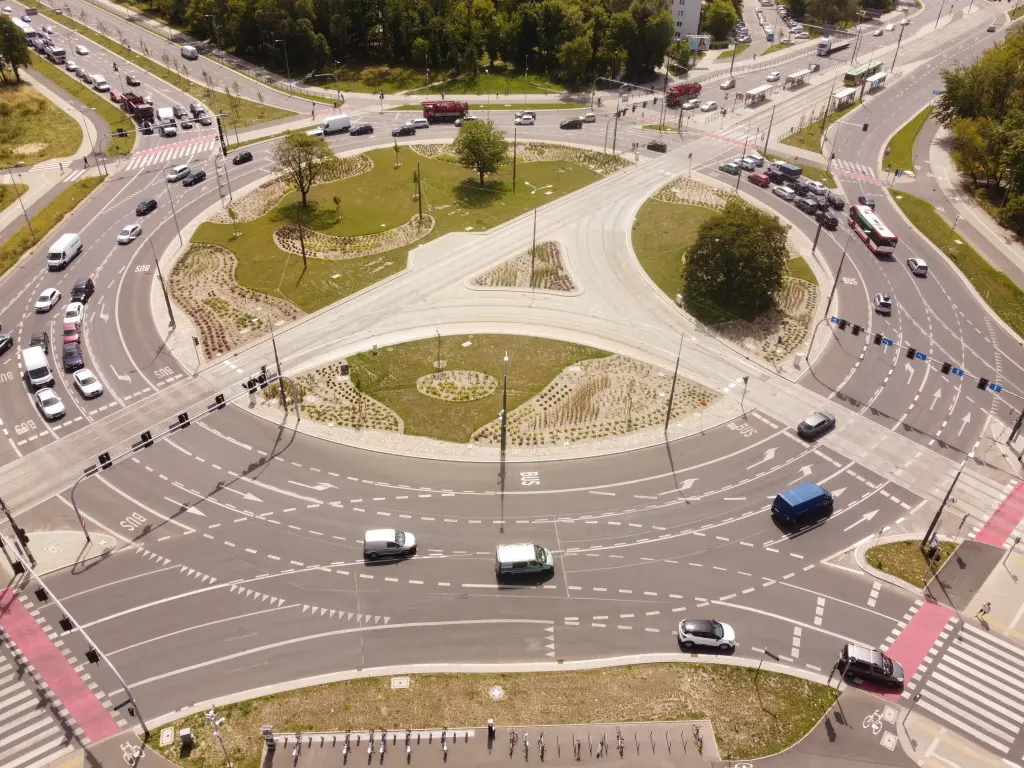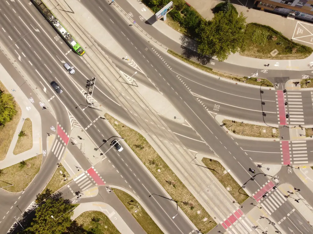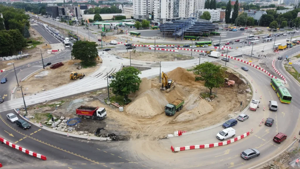 RECONSTRUCCIÓN DEL NUDO VIARIO Y TRANVIARIO DE RONDO RATAJE, POZNAŃ (POLONIA) Proyecto integral de modernización del emblemático nudo de Rondo Rataje en Poznań, que abarca múltiples disciplinas: carreteras, vía tranviaria, redes sanitarias, instalaciones eléctricas y sistemas de telecomunicaciones. En el ámbito viario, se reconstruyó la superficie del anillo principal y de sus cuatro accesos (en todas las direcciones), adaptándolos a un diseño de cuatro carriles y renovando tramos de aproximadamente 500 metros por acceso. Las obras eléctricas y de telecomunicaciones incluyeron la modernización de la red de tracción y del sistema de alimentación de los aparatos de vía, la instalación de paneles informativos en paradas de autobús, un nuevo sistema de alumbrado y un sistema inteligente de control del tráfico. En cuanto a la infraestructura tranviaria, se sustituyó la antigua estructura de balasto por una plataforma de losa de hormigón, ejecutada in situ en la zona del anillo y con elementos prefabricados en los accesos. Esta solución, combinada con un relleno de poliuretano, permite reducir significativamente el ruido generado por el paso de los tranvías. El alcance también comprendió la renovación de la red de saneamiento, la instalación de nuevas canalizaciones de aguas pluviales y la ejecución de una nueva conducción de gas.